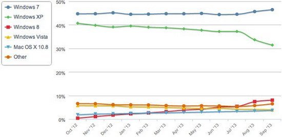 Windows 8目前已經(jīng)占據(jù)了主流桌面系統(tǒng)流量的8%,但相比Windows 7的46%甚至是已近遲暮的XP(31%),仍有較大的差距。