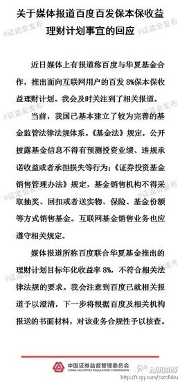 10月23日消息,據中國證監會辦公廳新聞辦官方微博消息,證監會表示,媒體報道所稱百度與華夏基金推出的理財計劃目標年化收益率8%,不符合相關法律法規要求。證監會注意到百度已就相關報道予以澄清,下一步將根據百度及相關機構報送的書面材料,對該業務合規性予以檢查。