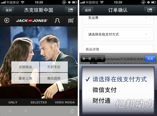 目前,最典型的獲得微信支付接口且搭建了微信店鋪的服裝品牌商是杰克瓊斯,用戶(hù)不僅可以在其微信店鋪內(nèi)選購(gòu)商品,利用微信支付或財(cái)付通支付,還可以在線(xiàn)下選購(gòu)衣服,然后通過(guò)掃碼到線(xiàn)上下單。