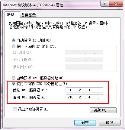 6.點擊單選按鈕“使用下面的DNS服務器地址:”,在首選DNS服務器和備用DNS服務器中輸入SDNS的地址:“1.2.4.8”與“210.2.4.8”。