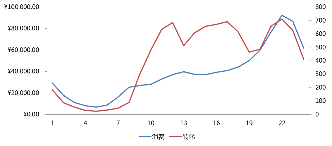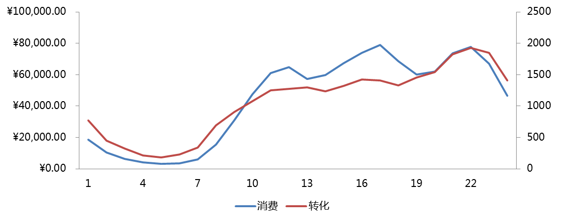 圖1-2(案例客戶(hù)某月PC端分時(shí)段消費(fèi)、轉(zhuǎn)化數(shù)據(jù))