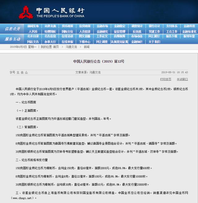 中國(guó)人民銀行定于2019年6月5日發(fā)行世界遺產(chǎn)(平遙古城)金銀紀(jì)念幣一套。該套金銀紀(jì)念幣共3枚,其中金質(zhì)紀(jì)念幣2枚,銀質(zhì)紀(jì)念幣1枚,均為中華人民共和國(guó)法定貨幣。
